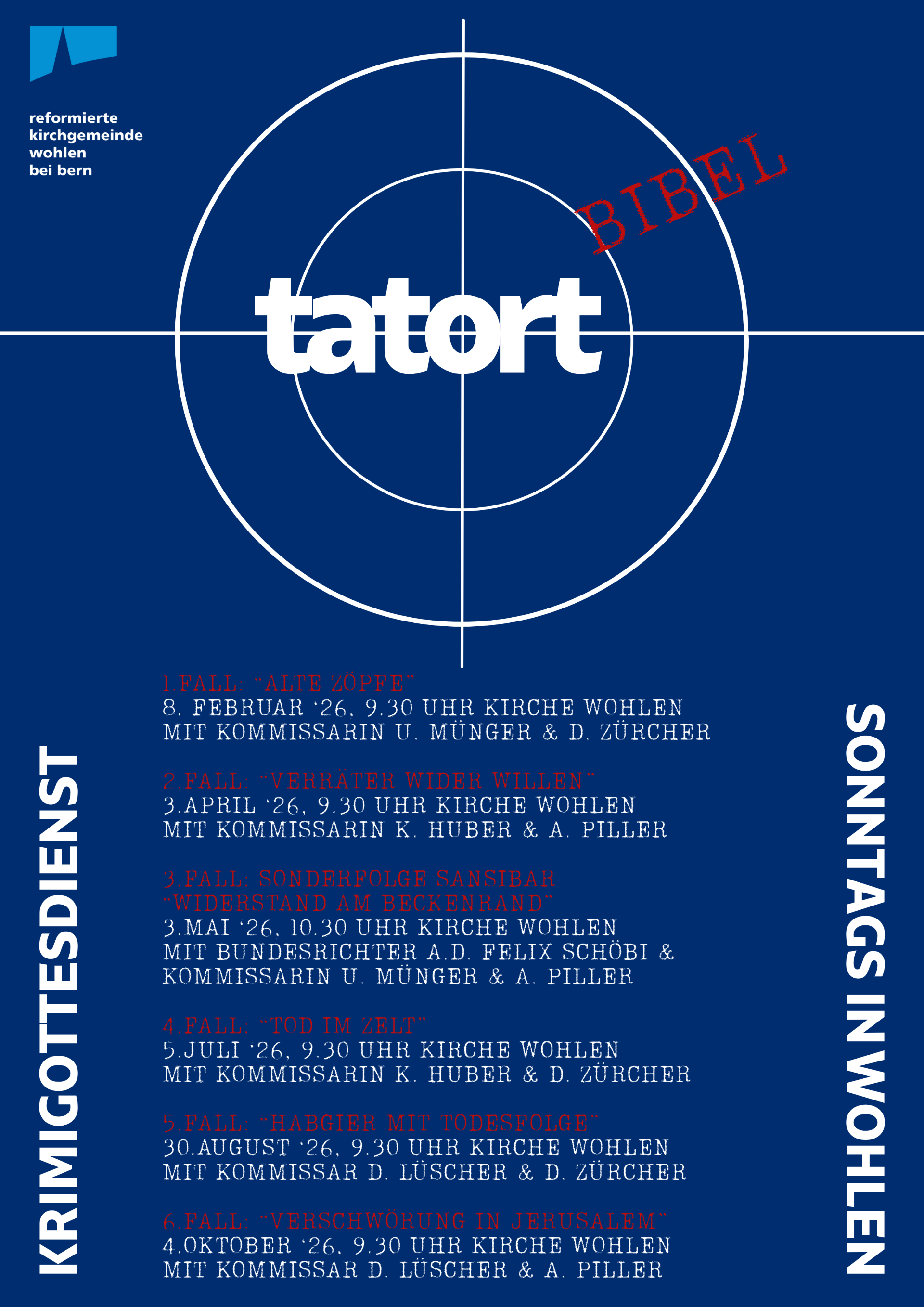 Im Februar beginnt die diesjährigen Predigtreihe: «Tatort Bibel – der Krimigottesdienst». In diesen Gottesdiensten begegnen uns die Kriminalfälle der Bibel – Verrat und Intrige, Betrug und manchmal sogar Mord und Totschlag. Gemeinsam sichern wir Spuren, prüfen Motive und teilen Verdachtsmomente. Die Gemeinde wird zum Ermittlungsteam an den Tatorten des Alten und Neuen Testaments. Dazu erklingen die Titelmelodien der bekannten Krimis auf der Orgel.